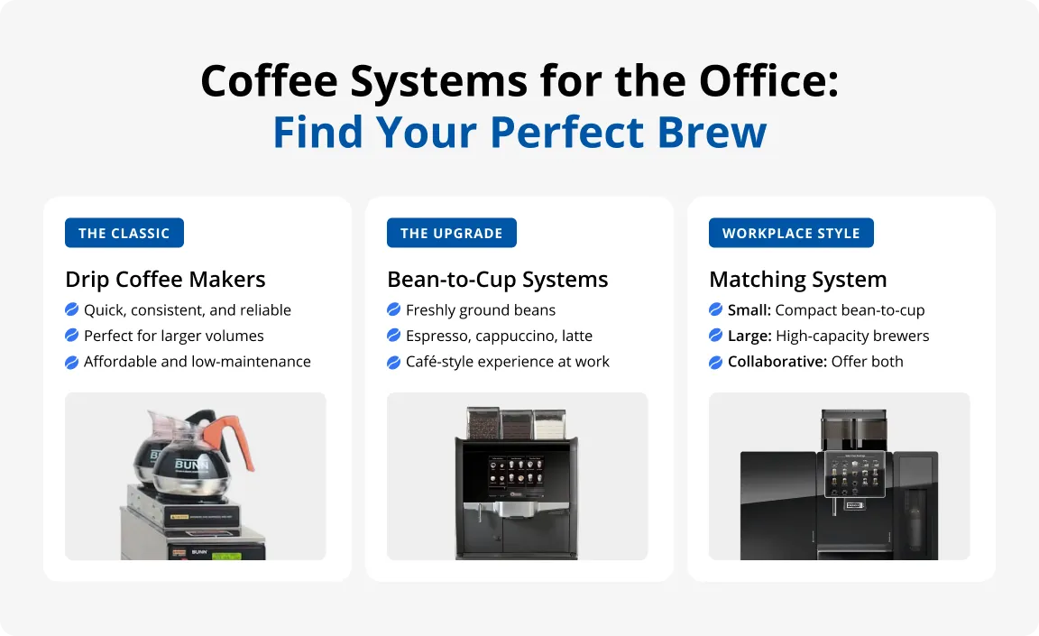 Not all coffee systems are created equal—and choosing the right one can make or break your office’s daily rhythm. Whether you’re brewing for five employees or five hundred, the right setup impacts morale, productivity, and the overall breakroom experience.